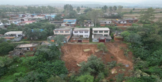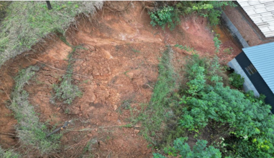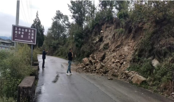 16时,山体滑坡发生,造成坡顶4户房屋地基悬空、1间房屋及道路损毁。由于风险隐患发现处置及时,无人员伤亡。