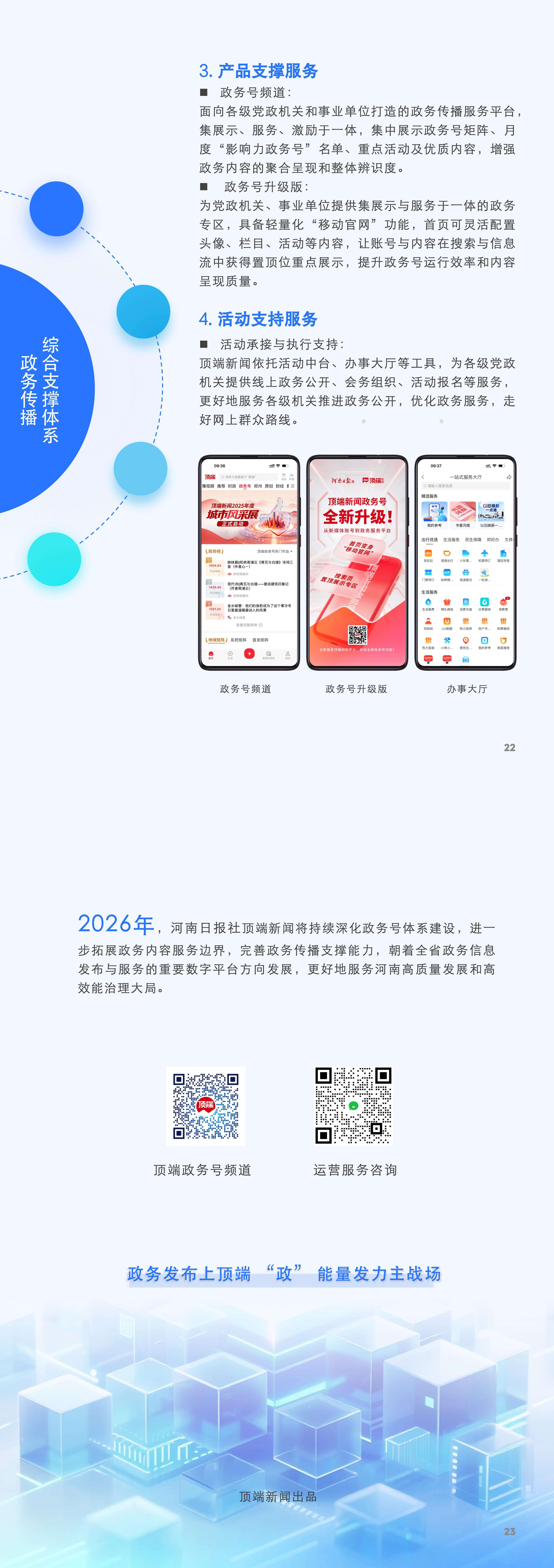 报告还介绍了顶端新闻在政务号运营模式上的探索。通过完善激励机制、优化内容共创和传播支持方式,平台不断提升政务内容传播的确定性和可持续性;政务号频道和升级版等功能,进一步增强了政务信息的集中展示能力和群众触达效率,推动政务新媒体从“发信息”向“做服务”延伸。