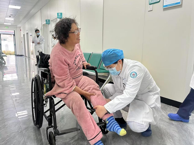 (图片说明:2025年6月医院接诊大厅,上机前宋阿姨腿疼,推送宋阿姨检查,等待过程中,为其扶腿,减轻其痛苦。)