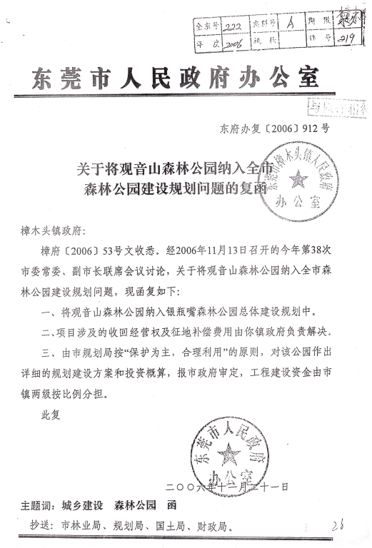 上图为市政府作出的《关于将观音山森林公园纳入全市森林公园建设规划问题的复函》