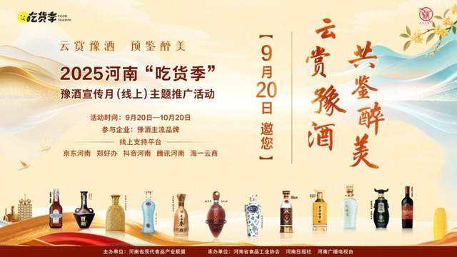 作为河南省“吃货季”系列活动的重要组成部分,豫酒宣传月旨在贯彻落实工信部、商务部、市场监管总局关于“吃货季”食品提质扩需的工作部署,进一步弘扬中原酒文化,激发节日消费潜力,推动豫酒品牌走向全国、走进千家万户。因此,考虑到今年市场环境和形势的变化,2025年度的豫酒宣传月活动,除了线下活动外,还重点打通了线上渠道和平台,以“云赏豫酒 预鉴醉美”为主题,依托京东、郑好办、抖音、腾讯等多个主流线上平台,集中展示、推广豫酒品牌,意在打造一场贯穿中秋、国庆的豫酒文化盛宴。