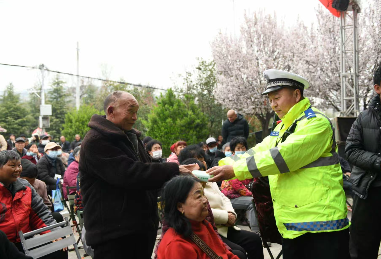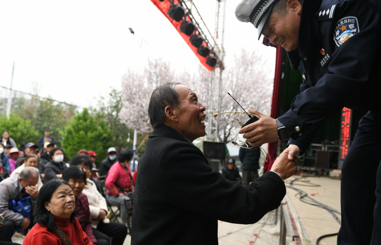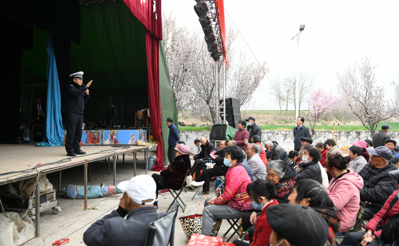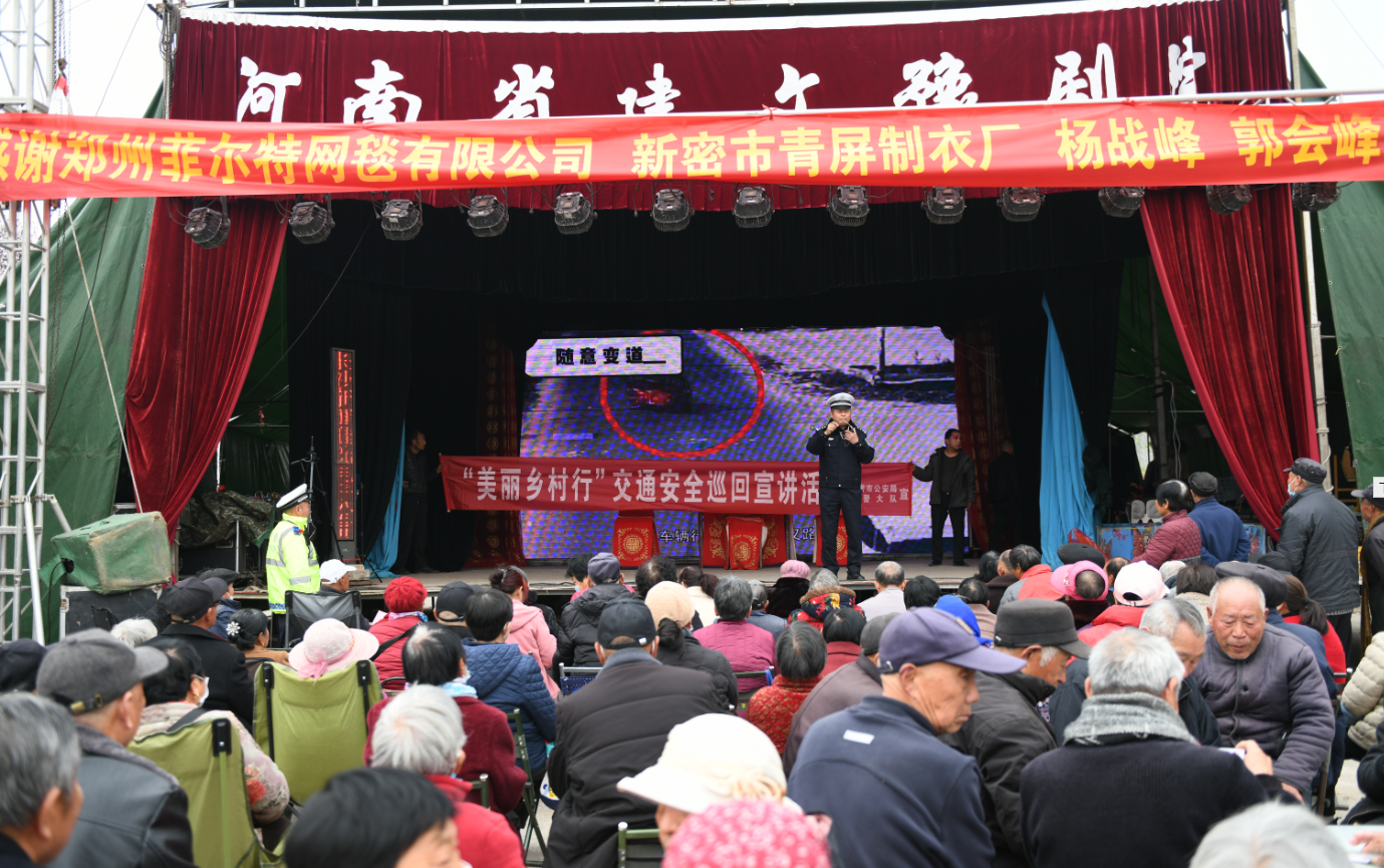 为筑牢农村道路交通安全防线,提升群众交通安全意识与自我保护意识,3月23日,新密市公安局交警大队宣传小分队民警辅警深入袁庄镇青河村开展“美丽乡村行”交通安全巡回宣讲活动,向戏迷群众宣讲交通安全出行知识。
