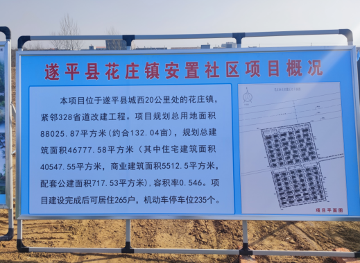 据了解,遂平县西游记大道花庄段拆迁安置(花庄社区安置房)项目位于遂平县城西20公里处花庄镇,紧邻S328省道改建工程。项目规划总用地面积88025方米(约合132.04),规划总建筑面积46777.58平方米(其中住宅建筑面积40547.55平方米,商业建筑面积5512.5平方米,配套公建面积717.53平方米),容积率0.546。项目建设完成后可居住265户,机动车停车位235个。(倪光)