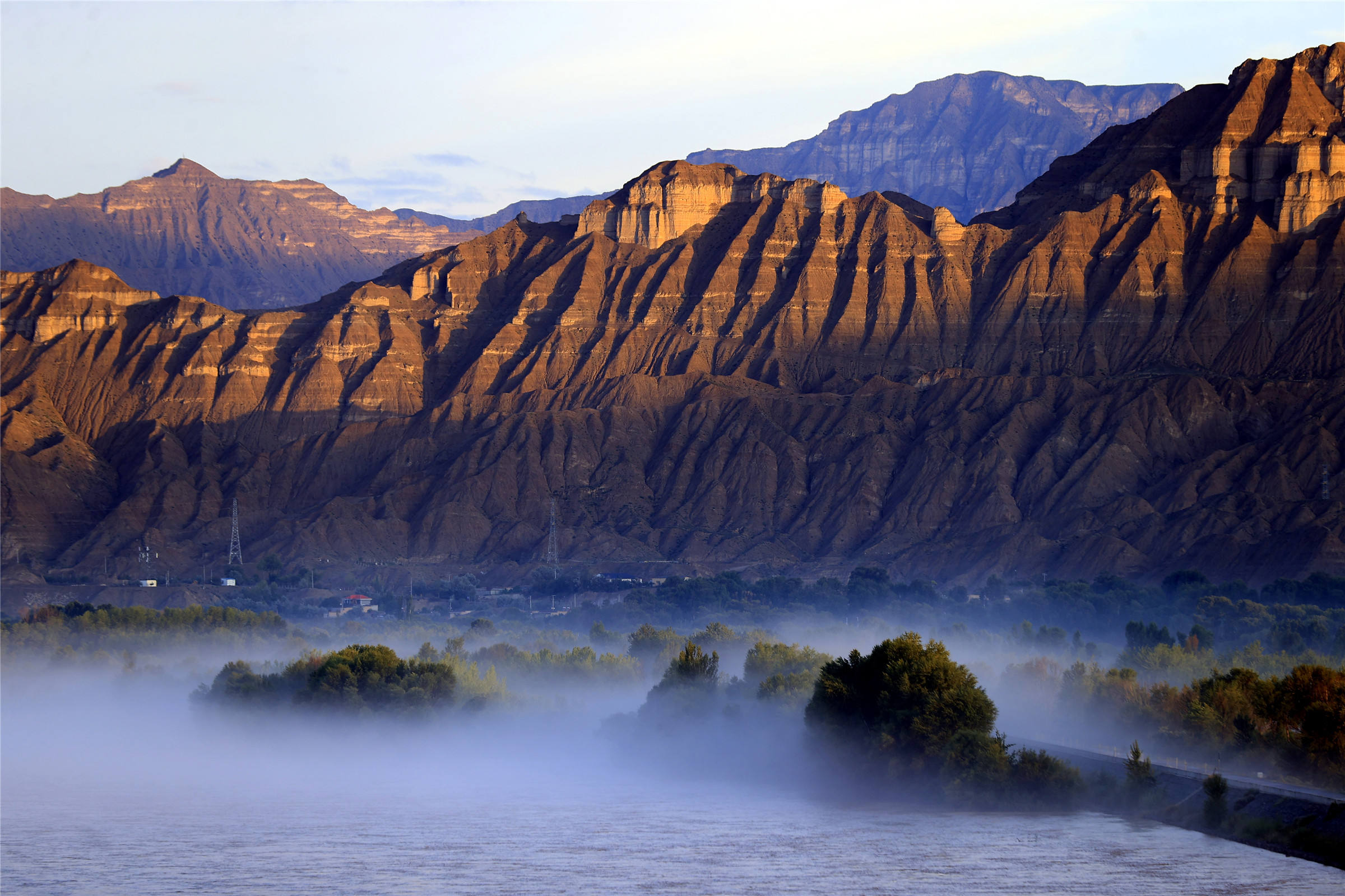 6月18日,清晨第一缕阳光洒落在青海省海南藏族自治州贵德县黄河岸边的山上,与水雾相呼应,如一幅美丽的画卷。