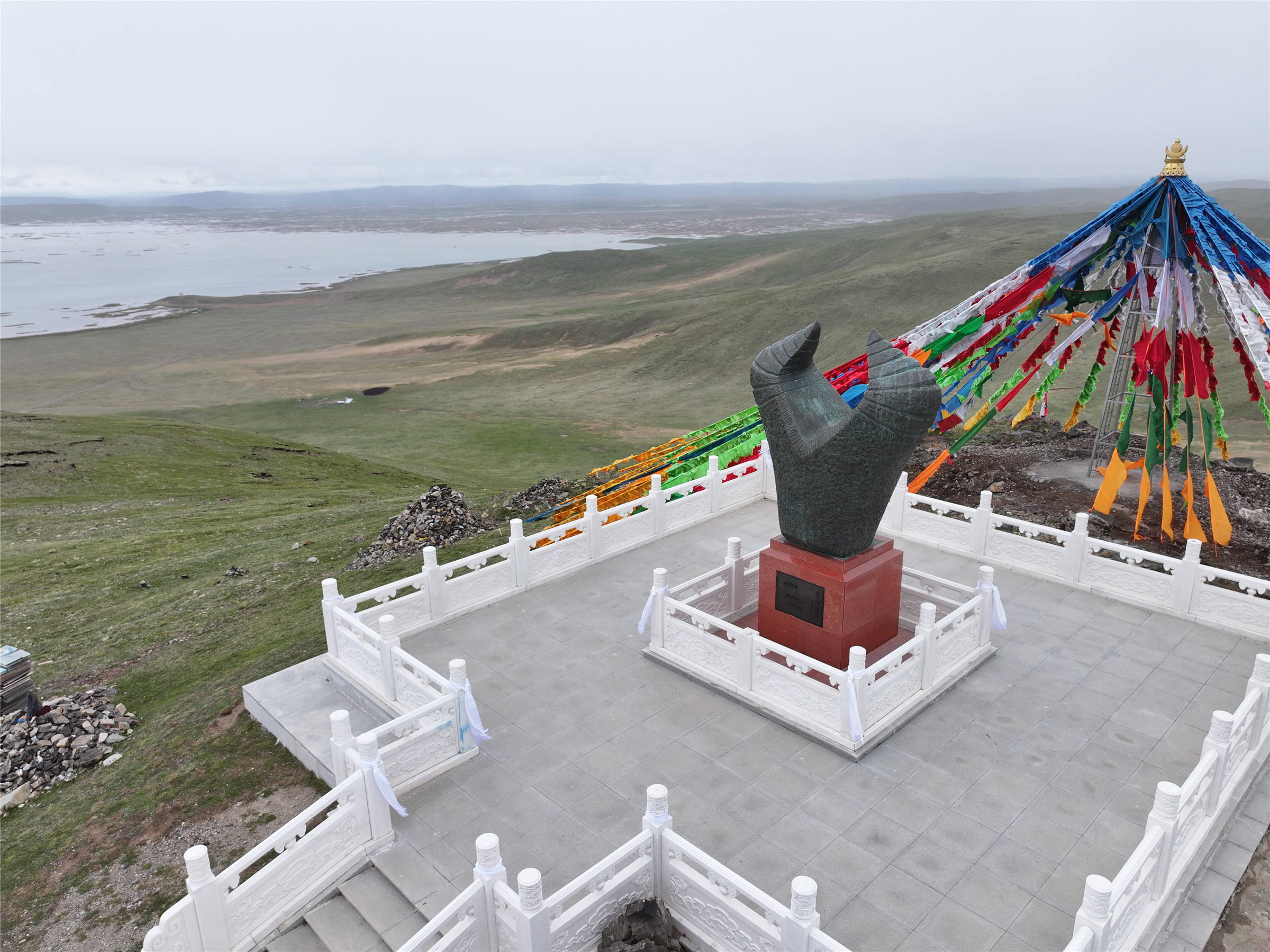 6月21日,青海省果洛藏族自治州玛多县三江源国家级自然保护区下起了小雪,处于核心区的黄河源牛头碑守望着鄂陵湖。