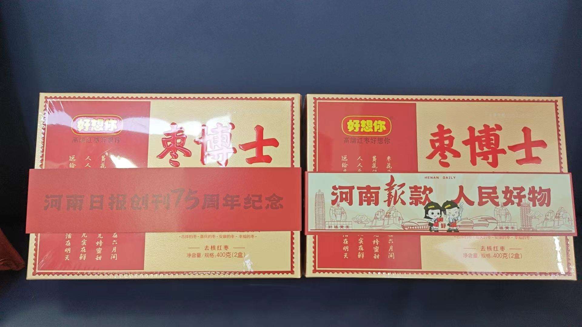 近日,河南日报联合好想你健康食品股份有限公司(以下简称“好想你”)推出联名款产品——河南“报”款好想你限定礼盒,在主题店上架销售。好想你负责人表示,希望通过此次活动致敬新闻工作者,同时也致敬河南日报笔耕不辍所记录下的这个伟大时代。