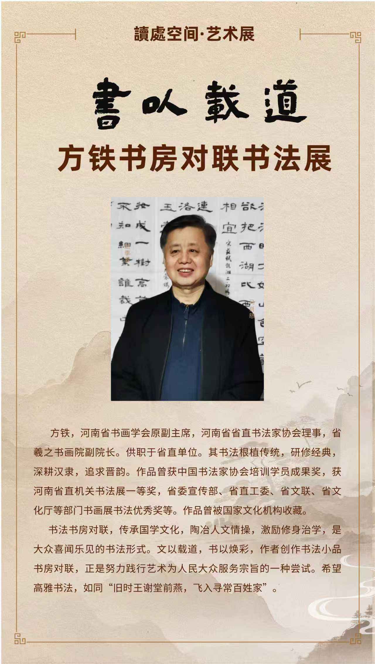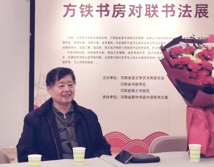 1 月8日,由河南省直文联、河南省羲之书画院、河南省书画学会主办,河南省新华书店中原图书大厦承办的《书以载道——方铁书房对联书法展》在郑州中原图书大厦二楼展厅开幕。