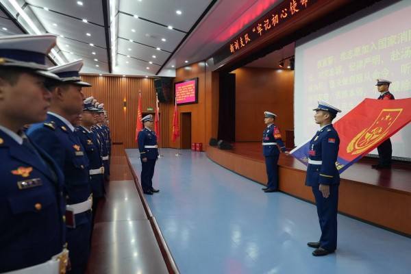新训支队坚持将筑牢思想政治根基置于首位。在该支队训词宣誓仪式上,全体新消防员面向队旗,高举右拳,许下“对党忠诚、纪律严明、赴汤蹈火、竭诚为民”的铿锵誓言。新消防员代表黄耀辉表示:“这一刻,我更加深刻地认识到肩上沉甸甸的神圣使命。我们将坚决以队旗为引领,以训词为号令,为守护人民群众生命财产安全一往无前。”