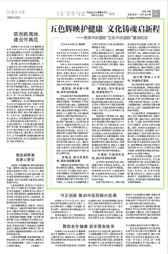 如今的焦煤中央医院,五色辉映间彰显着责任与担当。红色基因凝聚精神力量,金色党建驱动发展引擎,白色廉洁守护职业底线,绿色发展践行生态理念,橙色暖意传递人文关怀。在“五彩中央医院”建设的征程上,该院正以更精湛的技术、更温馨的服务、更昂扬的姿态,书写着新时代医院高质量发展的新篇章。