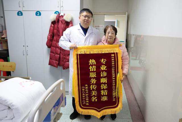 两人谈心后,赵阿姨把一面写着:“专业诊断保精准 热情服务传美名”的锦旗送到佘亚鹏手中。
