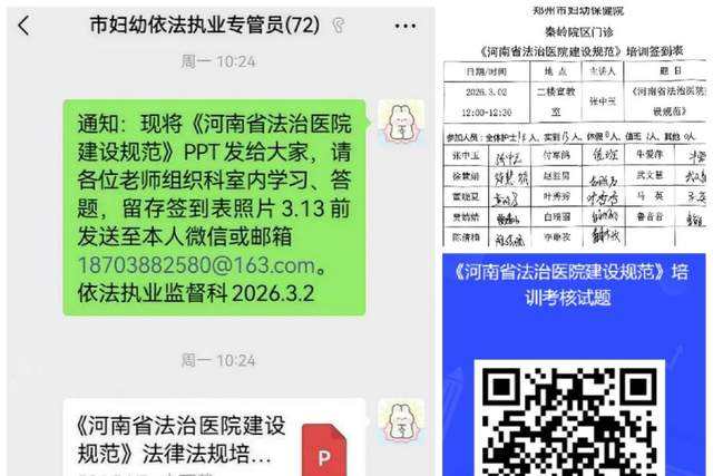 作为妇幼健康专属机构,郑州市妇幼保健院于3月3日组织开展《规范》全员专题培训,紧扣机构功能定位,从政策对标、依法决策、依法管理、依法执业、法治宣教等方面明确落地路径。培训突出妇幼特色,将母婴安全保障、公共卫生资金使用纳入重大决策合法性审核;采用“内部法治部门+外聘律师”模式,配齐专职法治人员;强化出生医学证明、辅助生殖、产前诊断等特色领域监管。医院制定阶段性工作计划,3月底前完成全员考核,4-6月开展合规自查,7-12月完善长效机制,倾力打造“妇幼法治护航”文化品牌,实现法治建设与妇幼健康服务深度融合。